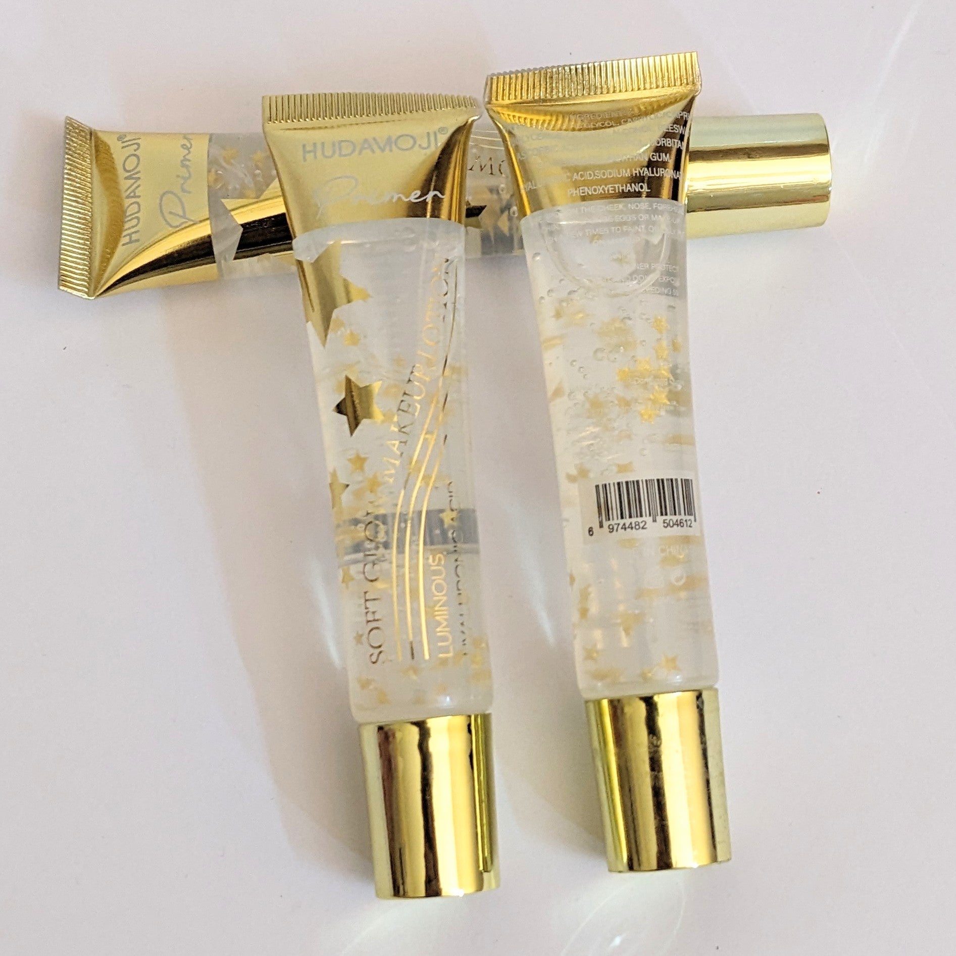 Hudamoji Gold Primer is a 30 ML tube designed to enhance makeup application. Its formulation provides a smooth base that may increase foundation adherence, potentially resulting in longer-lasting wear. The primer also contributes to an even skin texture, allowing for a polished appearance.